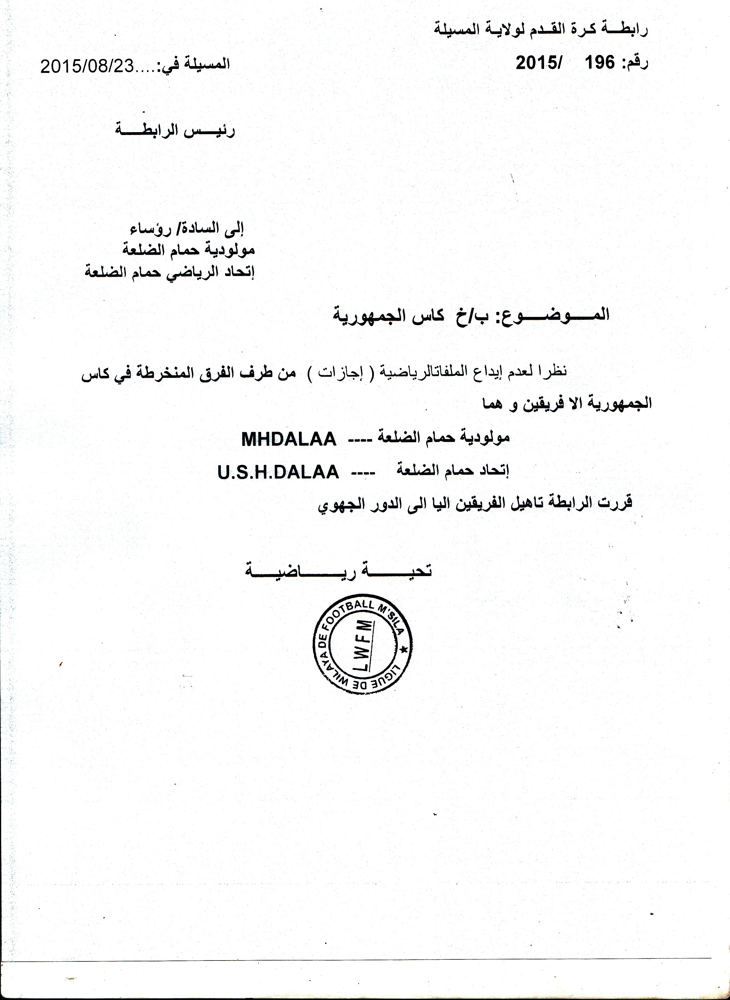 | نظرا لعدم ايداع الملفات الرياضية ( اجازات ) من طرف الفرق المنخرطة في كاس الجمهورية الا فريقين : اتحاد حمام الضلعة و م حمام الضلعة قررت الرابطة تاهيل الفريقين الي الدور الجهوي لتصفيات كأس الجمهورية للموسم 2016/2015 |